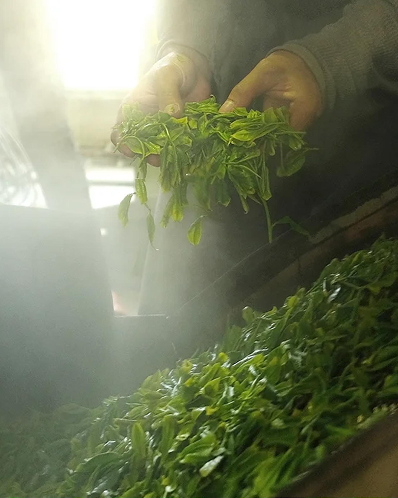 Les feuilles sont ensuite séchées dans de grands filets d'air chaud qui mesurent 6 à 8 mètres de hauteur. Avoir suffisamment d'espace et garder les feuilles en mouvement permet un séchage uniforme qui conserve parfaitement la feuille.